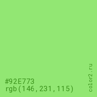 Цвет #92E773 в цветовой модели RGB обозначается тремя октетами (146, 231, 115) в десятичном формате и #92E773 в шестнадцатиричном (hex) формате, которые являются интенсивностью красного 146 (hex 92), интенсивность зелёного 231 (hex E7) и интенсивность синего 115 (hex 73).