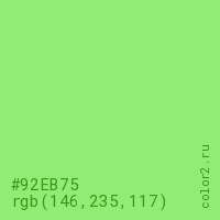 Цвет #92EB75 в цветовой модели RGB обозначается тремя октетами (146, 235, 117) в десятичном формате и #92EB75 в шестнадцатиричном (hex) формате, которые являются интенсивностью красного 146 (hex 92), интенсивность зелёного 235 (hex EB) и интенсивность синего 117 (hex 75).
