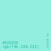 Цвет #92EEDE в цветовой модели RGB обозначается тремя октетами (146, 238, 222) в десятичном формате и #92EEDE в шестнадцатиричном (hex) формате, которые являются интенсивностью красного 146 (hex 92), интенсивность зелёного 238 (hex EE) и интенсивность синего 222 (hex DE).