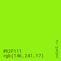 Цвет #92F111 в цветовой модели RGB обозначается тремя октетами (146, 241, 17) в десятичном формате и #92F111 в шестнадцатиричном (hex) формате, которые являются интенсивностью красного 146 (hex 92), интенсивность зелёного 241 (hex F1) и интенсивность синего 17 (hex 11).