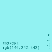 Цвет #92F2F2 в цветовой модели RGB обозначается тремя октетами (146, 242, 242) в десятичном формате и #92F2F2 в шестнадцатиричном (hex) формате, которые являются интенсивностью красного 146 (hex 92), интенсивность зелёного 242 (hex F2) и интенсивность синего 242 (hex F2).