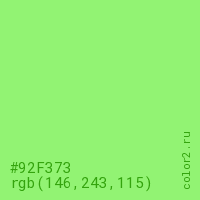 Цвет #92F373 в цветовой модели RGB обозначается тремя октетами (146, 243, 115) в десятичном формате и #92F373 в шестнадцатиричном (hex) формате, которые являются интенсивностью красного 146 (hex 92), интенсивность зелёного 243 (hex F3) и интенсивность синего 115 (hex 73).