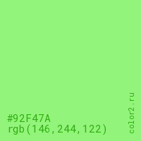 Цвет #92F47A в цветовой модели RGB обозначается тремя октетами (146, 244, 122) в десятичном формате и #92F47A в шестнадцатиричном (hex) формате, которые являются интенсивностью красного 146 (hex 92), интенсивность зелёного 244 (hex F4) и интенсивность синего 122 (hex 7A).