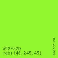 Цвет #92F52D в цветовой модели RGB обозначается тремя октетами (146, 245, 45) в десятичном формате и #92F52D в шестнадцатиричном (hex) формате, которые являются интенсивностью красного 146 (hex 92), интенсивность зелёного 245 (hex F5) и интенсивность синего 45 (hex 2D).
