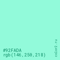 Цвет #92FADA в цветовой модели RGB обозначается тремя октетами (146, 250, 218) в десятичном формате и #92FADA в шестнадцатиричном (hex) формате, которые являются интенсивностью красного 146 (hex 92), интенсивность зелёного 250 (hex FA) и интенсивность синего 218 (hex DA).