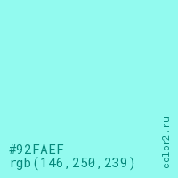 Цвет #92FAEF в цветовой модели RGB обозначается тремя октетами (146, 250, 239) в десятичном формате и #92FAEF в шестнадцатиричном (hex) формате, которые являются интенсивностью красного 146 (hex 92), интенсивность зелёного 250 (hex FA) и интенсивность синего 239 (hex EF).