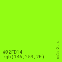 Цвет #92FD14 в цветовой модели RGB обозначается тремя октетами (146, 253, 20) в десятичном формате и #92FD14 в шестнадцатиричном (hex) формате, которые являются интенсивностью красного 146 (hex 92), интенсивность зелёного 253 (hex FD) и интенсивность синего 20 (hex 14).