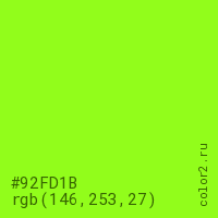Цвет #92FD1B в цветовой модели RGB обозначается тремя октетами (146, 253, 27) в десятичном формате и #92FD1B в шестнадцатиричном (hex) формате, которые являются интенсивностью красного 146 (hex 92), интенсивность зелёного 253 (hex FD) и интенсивность синего 27 (hex 1B).