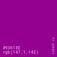 Цвет #93018E в цветовой модели RGB обозначается тремя октетами (147, 1, 142) в десятичном формате и #93018E в шестнадцатиричном (hex) формате, которые являются интенсивностью красного 147 (hex 93), интенсивность зелёного 1 (hex 01) и интенсивность синего 142 (hex 8E).