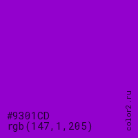 Цвет #9301CD в цветовой модели RGB обозначается тремя октетами (147, 1, 205) в десятичном формате и #9301CD в шестнадцатиричном (hex) формате, которые являются интенсивностью красного 147 (hex 93), интенсивность зелёного 1 (hex 01) и интенсивность синего 205 (hex CD).