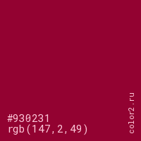 Цвет #930231 в цветовой модели RGB обозначается тремя октетами (147, 2, 49) в десятичном формате и #930231 в шестнадцатиричном (hex) формате, которые являются интенсивностью красного 147 (hex 93), интенсивность зелёного 2 (hex 02) и интенсивность синего 49 (hex 31).