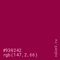 Цвет #930242 в цветовой модели RGB обозначается тремя октетами (147, 2, 66) в десятичном формате и #930242 в шестнадцатиричном (hex) формате, которые являются интенсивностью красного 147 (hex 93), интенсивность зелёного 2 (hex 02) и интенсивность синего 66 (hex 42).