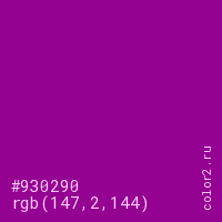 Цвет #930290 в цветовой модели RGB обозначается тремя октетами (147, 2, 144) в десятичном формате и #930290 в шестнадцатиричном (hex) формате, которые являются интенсивностью красного 147 (hex 93), интенсивность зелёного 2 (hex 02) и интенсивность синего 144 (hex 90).