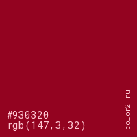 Цвет #930320 в цветовой модели RGB обозначается тремя октетами (147, 3, 32) в десятичном формате и #930320 в шестнадцатиричном (hex) формате, которые являются интенсивностью красного 147 (hex 93), интенсивность зелёного 3 (hex 03) и интенсивность синего 32 (hex 20).