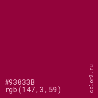 Цвет #93033B в цветовой модели RGB обозначается тремя октетами (147, 3, 59) в десятичном формате и #93033B в шестнадцатиричном (hex) формате, которые являются интенсивностью красного 147 (hex 93), интенсивность зелёного 3 (hex 03) и интенсивность синего 59 (hex 3B).