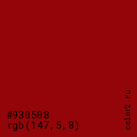 Цвет #930508 в цветовой модели RGB обозначается тремя октетами (147, 5, 8) в десятичном формате и #930508 в шестнадцатиричном (hex) формате, которые являются интенсивностью красного 147 (hex 93), интенсивность зелёного 5 (hex 05) и интенсивность синего 8 (hex 08).