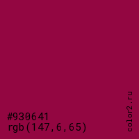 Цвет #930641 в цветовой модели RGB обозначается тремя октетами (147, 6, 65) в десятичном формате и #930641 в шестнадцатиричном (hex) формате, которые являются интенсивностью красного 147 (hex 93), интенсивность зелёного 6 (hex 06) и интенсивность синего 65 (hex 41).
