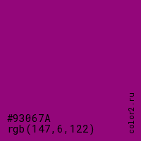 Цвет #93067A в цветовой модели RGB обозначается тремя октетами (147, 6, 122) в десятичном формате и #93067A в шестнадцатиричном (hex) формате, которые являются интенсивностью красного 147 (hex 93), интенсивность зелёного 6 (hex 06) и интенсивность синего 122 (hex 7A).