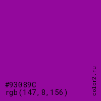 Цвет #93089C в цветовой модели RGB обозначается тремя октетами (147, 8, 156) в десятичном формате и #93089C в шестнадцатиричном (hex) формате, которые являются интенсивностью красного 147 (hex 93), интенсивность зелёного 8 (hex 08) и интенсивность синего 156 (hex 9C).