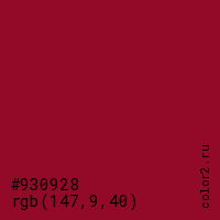 Цвет #930928 в цветовой модели RGB обозначается тремя октетами (147, 9, 40) в десятичном формате и #930928 в шестнадцатиричном (hex) формате, которые являются интенсивностью красного 147 (hex 93), интенсивность зелёного 9 (hex 09) и интенсивность синего 40 (hex 28).