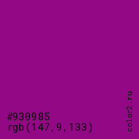 Цвет #930985 в цветовой модели RGB обозначается тремя октетами (147, 9, 133) в десятичном формате и #930985 в шестнадцатиричном (hex) формате, которые являются интенсивностью красного 147 (hex 93), интенсивность зелёного 9 (hex 09) и интенсивность синего 133 (hex 85).
