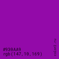Цвет #930AA9 в цветовой модели RGB обозначается тремя октетами (147, 10, 169) в десятичном формате и #930AA9 в шестнадцатиричном (hex) формате, которые являются интенсивностью красного 147 (hex 93), интенсивность зелёного 10 (hex 0A) и интенсивность синего 169 (hex A9).