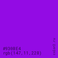 Цвет #930BE4 в цветовой модели RGB обозначается тремя октетами (147, 11, 228) в десятичном формате и #930BE4 в шестнадцатиричном (hex) формате, которые являются интенсивностью красного 147 (hex 93), интенсивность зелёного 11 (hex 0B) и интенсивность синего 228 (hex E4).