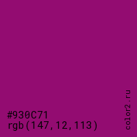 Цвет #930C71 в цветовой модели RGB обозначается тремя октетами (147, 12, 113) в десятичном формате и #930C71 в шестнадцатиричном (hex) формате, которые являются интенсивностью красного 147 (hex 93), интенсивность зелёного 12 (hex 0C) и интенсивность синего 113 (hex 71).