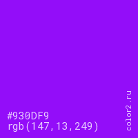 Цвет #930DF9 в цветовой модели RGB обозначается тремя октетами (147, 13, 249) в десятичном формате и #930DF9 в шестнадцатиричном (hex) формате, которые являются интенсивностью красного 147 (hex 93), интенсивность зелёного 13 (hex 0D) и интенсивность синего 249 (hex F9).