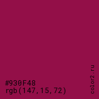 Цвет #930F48 в цветовой модели RGB обозначается тремя октетами (147, 15, 72) в десятичном формате и #930F48 в шестнадцатиричном (hex) формате, которые являются интенсивностью красного 147 (hex 93), интенсивность зелёного 15 (hex 0F) и интенсивность синего 72 (hex 48).