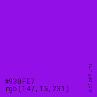 Цвет #930FE7 в цветовой модели RGB обозначается тремя октетами (147, 15, 231) в десятичном формате и #930FE7 в шестнадцатиричном (hex) формате, которые являются интенсивностью красного 147 (hex 93), интенсивность зелёного 15 (hex 0F) и интенсивность синего 231 (hex E7).