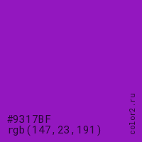 Цвет #9317BF в цветовой модели RGB обозначается тремя октетами (147, 23, 191) в десятичном формате и #9317BF в шестнадцатиричном (hex) формате, которые являются интенсивностью красного 147 (hex 93), интенсивность зелёного 23 (hex 17) и интенсивность синего 191 (hex BF).