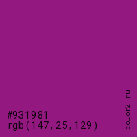 Цвет #931981 в цветовой модели RGB обозначается тремя октетами (147, 25, 129) в десятичном формате и #931981 в шестнадцатиричном (hex) формате, которые являются интенсивностью красного 147 (hex 93), интенсивность зелёного 25 (hex 19) и интенсивность синего 129 (hex 81).
