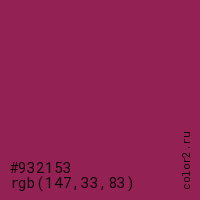 Цвет #932153 в цветовой модели RGB обозначается тремя октетами (147, 33, 83) в десятичном формате и #932153 в шестнадцатиричном (hex) формате, которые являются интенсивностью красного 147 (hex 93), интенсивность зелёного 33 (hex 21) и интенсивность синего 83 (hex 53).