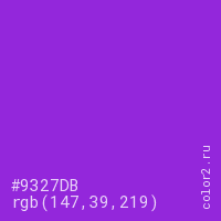 Цвет #9327DB в цветовой модели RGB обозначается тремя октетами (147, 39, 219) в десятичном формате и #9327DB в шестнадцатиричном (hex) формате, которые являются интенсивностью красного 147 (hex 93), интенсивность зелёного 39 (hex 27) и интенсивность синего 219 (hex DB).