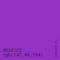 Цвет #9331C2 в цветовой модели RGB обозначается тремя октетами (147, 49, 194) в десятичном формате и #9331C2 в шестнадцатиричном (hex) формате, которые являются интенсивностью красного 147 (hex 93), интенсивность зелёного 49 (hex 31) и интенсивность синего 194 (hex C2).