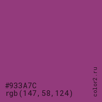 Цвет #933A7C в цветовой модели RGB обозначается тремя октетами (147, 58, 124) в десятичном формате и #933A7C в шестнадцатиричном (hex) формате, которые являются интенсивностью красного 147 (hex 93), интенсивность зелёного 58 (hex 3A) и интенсивность синего 124 (hex 7C).
