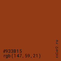 Цвет #933B15 в цветовой модели RGB обозначается тремя октетами (147, 59, 21) в десятичном формате и #933B15 в шестнадцатиричном (hex) формате, которые являются интенсивностью красного 147 (hex 93), интенсивность зелёного 59 (hex 3B) и интенсивность синего 21 (hex 15).