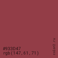 Цвет #933D47 в цветовой модели RGB обозначается тремя октетами (147, 61, 71) в десятичном формате и #933D47 в шестнадцатиричном (hex) формате, которые являются интенсивностью красного 147 (hex 93), интенсивность зелёного 61 (hex 3D) и интенсивность синего 71 (hex 47).
