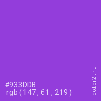 Цвет #933DDB в цветовой модели RGB обозначается тремя октетами (147, 61, 219) в десятичном формате и #933DDB в шестнадцатиричном (hex) формате, которые являются интенсивностью красного 147 (hex 93), интенсивность зелёного 61 (hex 3D) и интенсивность синего 219 (hex DB).