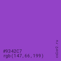 Цвет #9342C7 в цветовой модели RGB обозначается тремя октетами (147, 66, 199) в десятичном формате и #9342C7 в шестнадцатиричном (hex) формате, которые являются интенсивностью красного 147 (hex 93), интенсивность зелёного 66 (hex 42) и интенсивность синего 199 (hex C7).