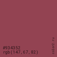 Цвет #934352 в цветовой модели RGB обозначается тремя октетами (147, 67, 82) в десятичном формате и #934352 в шестнадцатиричном (hex) формате, которые являются интенсивностью красного 147 (hex 93), интенсивность зелёного 67 (hex 43) и интенсивность синего 82 (hex 52).