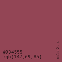 Цвет #934555 в цветовой модели RGB обозначается тремя октетами (147, 69, 85) в десятичном формате и #934555 в шестнадцатиричном (hex) формате, которые являются интенсивностью красного 147 (hex 93), интенсивность зелёного 69 (hex 45) и интенсивность синего 85 (hex 55).