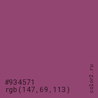 Цвет #934571 в цветовой модели RGB обозначается тремя октетами (147, 69, 113) в десятичном формате и #934571 в шестнадцатиричном (hex) формате, которые являются интенсивностью красного 147 (hex 93), интенсивность зелёного 69 (hex 45) и интенсивность синего 113 (hex 71).