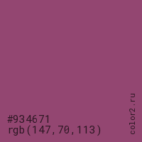 Цвет #934671 в цветовой модели RGB обозначается тремя октетами (147, 70, 113) в десятичном формате и #934671 в шестнадцатиричном (hex) формате, которые являются интенсивностью красного 147 (hex 93), интенсивность зелёного 70 (hex 46) и интенсивность синего 113 (hex 71).