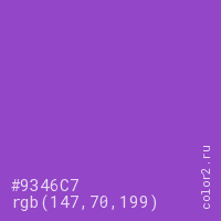 Цвет #9346C7 в цветовой модели RGB обозначается тремя октетами (147, 70, 199) в десятичном формате и #9346C7 в шестнадцатиричном (hex) формате, которые являются интенсивностью красного 147 (hex 93), интенсивность зелёного 70 (hex 46) и интенсивность синего 199 (hex C7).
