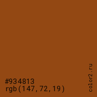 Цвет #934813 в цветовой модели RGB обозначается тремя октетами (147, 72, 19) в десятичном формате и #934813 в шестнадцатиричном (hex) формате, которые являются интенсивностью красного 147 (hex 93), интенсивность зелёного 72 (hex 48) и интенсивность синего 19 (hex 13).