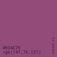 Цвет #934C79 в цветовой модели RGB обозначается тремя октетами (147, 76, 121) в десятичном формате и #934C79 в шестнадцатиричном (hex) формате, которые являются интенсивностью красного 147 (hex 93), интенсивность зелёного 76 (hex 4C) и интенсивность синего 121 (hex 79).