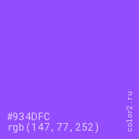 Цвет #934DFC в цветовой модели RGB обозначается тремя октетами (147, 77, 252) в десятичном формате и #934DFC в шестнадцатиричном (hex) формате, которые являются интенсивностью красного 147 (hex 93), интенсивность зелёного 77 (hex 4D) и интенсивность синего 252 (hex FC).