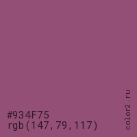 Цвет #934F75 в цветовой модели RGB обозначается тремя октетами (147, 79, 117) в десятичном формате и #934F75 в шестнадцатиричном (hex) формате, которые являются интенсивностью красного 147 (hex 93), интенсивность зелёного 79 (hex 4F) и интенсивность синего 117 (hex 75).